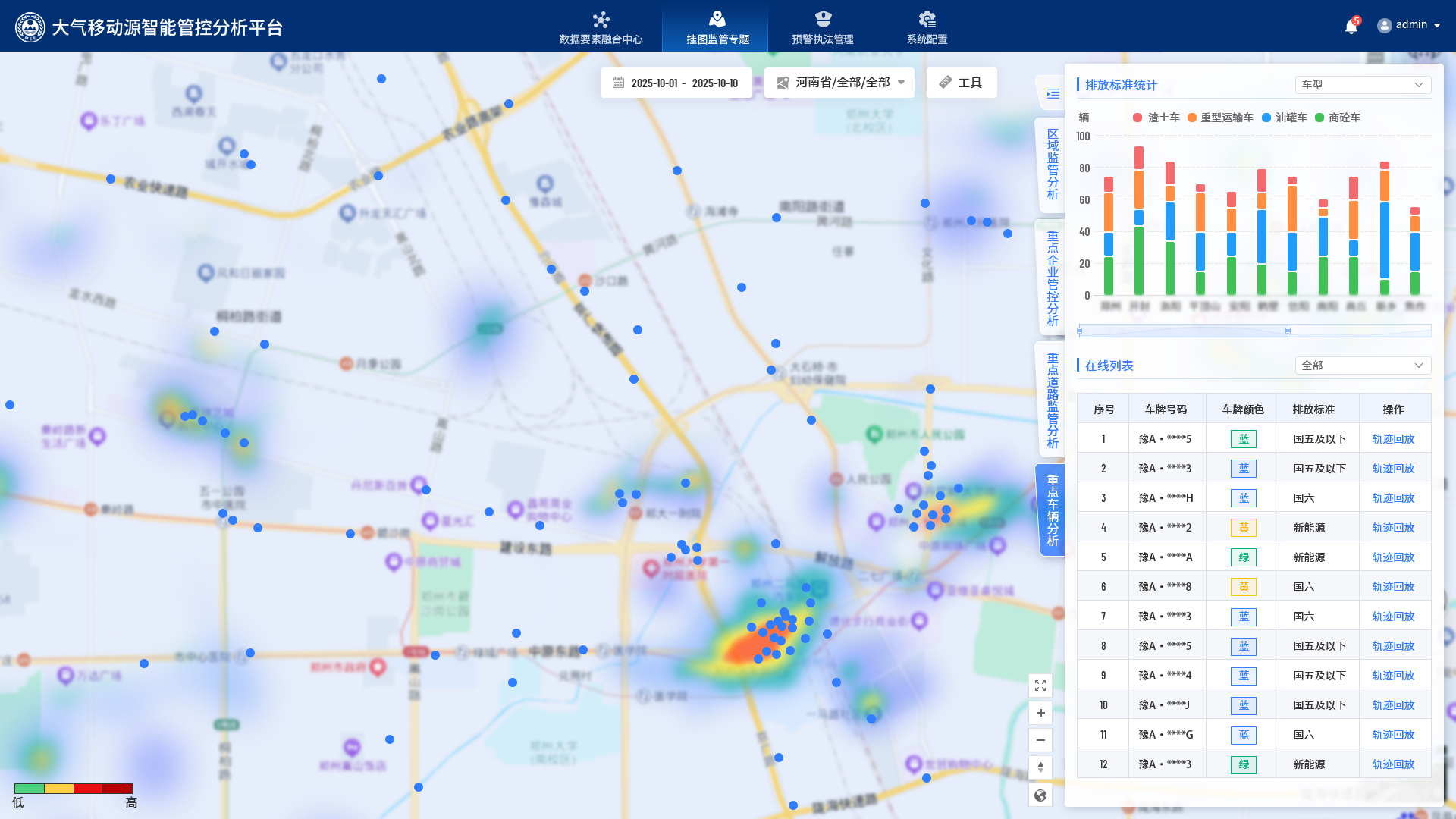 重污染天气应急支撑:在橙色预警及以上重污染应急期间,平台可快速识别高排放车辆聚集区域与违规上路情况,基于企业围栏货车活跃度,为精准管控给予决策依据。